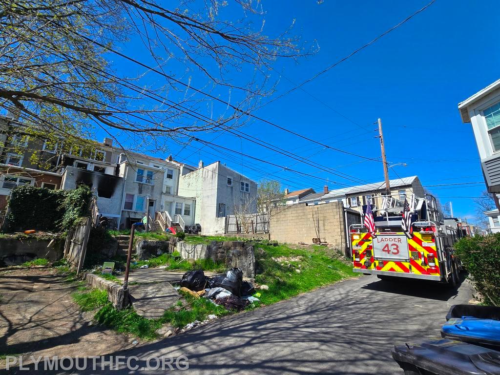 Ladder 43 responded and arrived as the 2nd due truck company. The operator positioned the truck to the "charlie side" alley behind the fire building and the crew went to work laddering the rear. The crew were then assigned to the roof to vertically ventilate and open up to check for further fire extension.